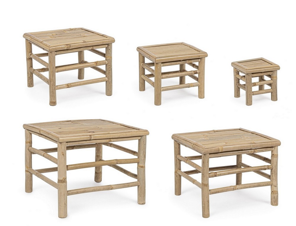 Joyce è il tavolino fisso quadrato dal design innovativo, costruito interamente in bambù a finitura naturale.
