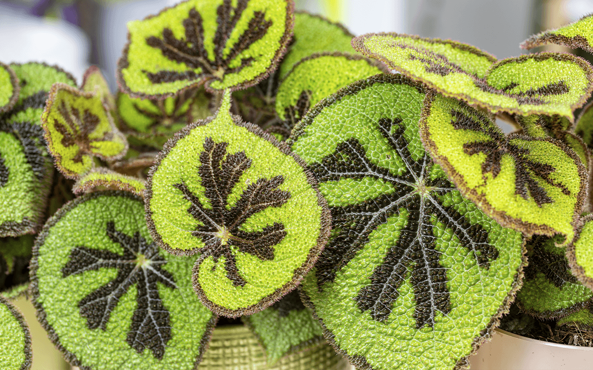 La Begonia masoniana, anche chiamata “Begonia Croce di ferro” in riferimento alla sua texture fogliare che crea una trama a forma di croce marrone scuro, è famosa soprattutto per le sue foglie ruvide al tatto, per via delle piccole "bolle" in rilievo. In primavera ed estate questa begonia si colora ulteriormente grazie ai suoi fiori bianchi e rosa.